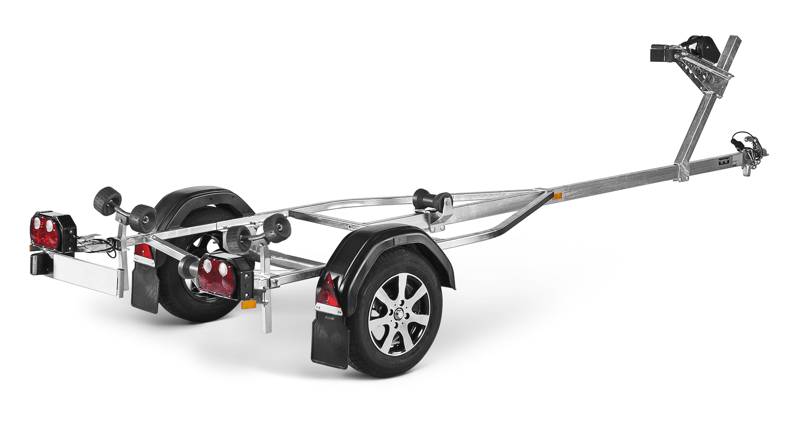 Opplagshengere for sikker opphenting og kortere transportetapper, samt for å lagre båten. Funksjonaliteten med vinsj og ruller er den samme som for bremsede og ubremsede båthengere. Vårt X-line-sortiment inkluderer ulike modeller, bl.a. ruller med ekstra høy kvalitet. Vognen som er vist på bildet kan ha ekstrautstyr.